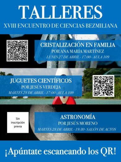 Como en ediciones anteriores del Encuentro de Ciencias Bezmiliana, la organización de esta Feria de la Ciencia ofrece una serie de talleres para participar por la tarde, con la idea de que puedan disfrutar de ellos profesorado, familias y alumnado. En dos de ellos es necesario inscribirse, ya que las plazas son limitadas por aforo del laboratorio:
